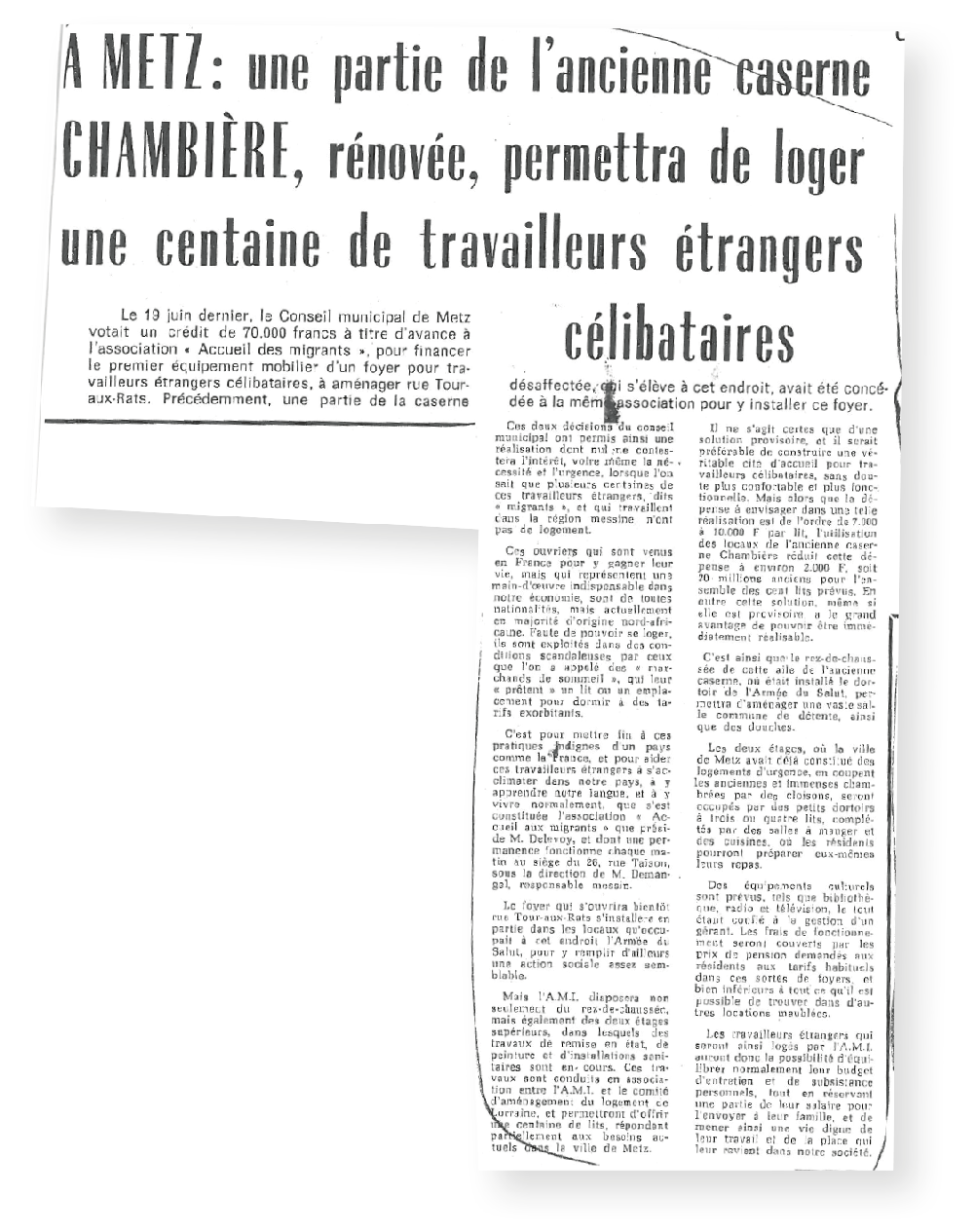 Maurice Becker se souvient que la question des travailleurs migrants fut posée pour la première fois en 1959. Les travaux engagés par la SOLLAC à Grandrange allaient durer trois ans sur un chantier nécessitant la présence de 600 à 800 ouvriers migrants.
